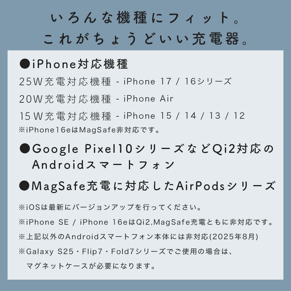 | 対応機種 | 「マグネット式ワイヤレス充電(Qi2/MagSafe)」に対応した機種や、専用ケースでお使いいただけます。 ■Apple iPhone17/17 Pro/17Pro Max/Air iPhone16/16 Plus/16 Pro/16 Pro Max iPhone15/15 Plus/15 Pro/15 Pro Max iPhone14/14 Plus/14 Pro/14 Pro Max iPhone13/13 mini/13 Pro/13 Pro Max iPhone12/12 mini/12 Pro/12 Pro Max MagSafe充電に対応したAirPods/AirPods Pro MagSafe対応ケース など、MagSafeに対応のiPhone/AirPodsシリーズに対応 ※iOSは最新にバージョンアップを行ってください。 ※iPhone 16e/SEシリーズは非対応です。 ■Android Google Pixel 10 / 10 Proシリーズ(Google Pixelsnap対応) Qi2・マグネット式ワイヤレス充電対応ケース ※上記以外のAndroidスマートフォン本体には非対応(2025年8月現在)です ※Galaxy S25・Flip7・Fold7シリーズでご使用の場合は、マグネットケースが必要になります。 |